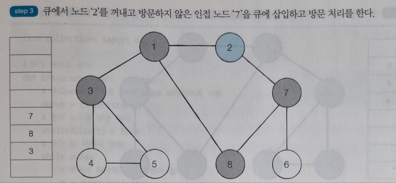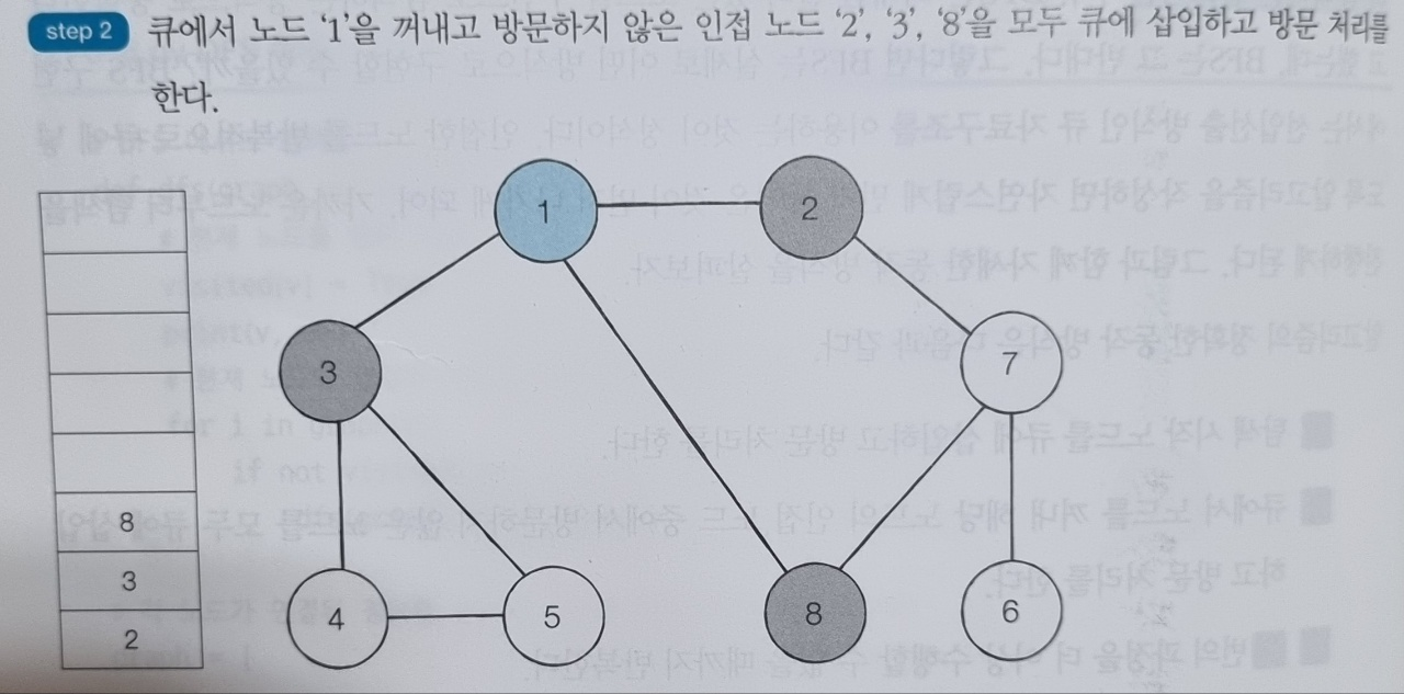 - 큐에서 노드를 꺼내 해당 노드의 인접 노드 중에서 방문하지 않은 노드를 모두 큐에 삽입하고 방문 처리를 한다.