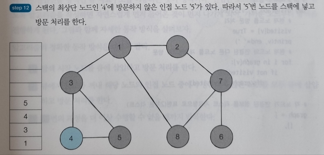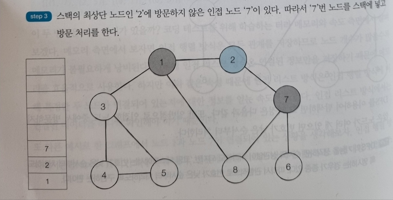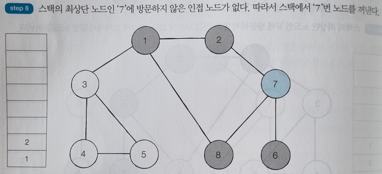 ※ '방문 처리'는 스택에 한 번 삽입되어 처리된 노드가 다시 삽입되지 않게 체크하는 것을 의미한다. 방문 처리를 함으로써 각 노드를 한 번씩만 처리할 수 있다.