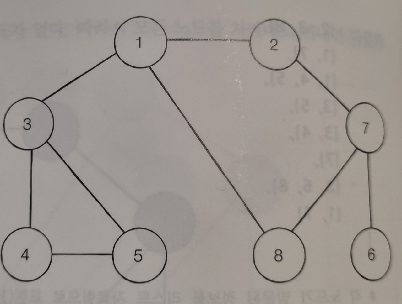 그래프는 노드(Node)랑 간선(Edge)으로 표현되며 이때 노드를 정점(Vertex)이라고도 말한다. 그래프 탐색이란 하나의 노드를 시작으로 다수의 노드를 방문하는 것을 말한다. 또한 두 노드가 간선으로 연결되어 있다면 '두 노드는 인접하다(Adjacent)'라고 표현한다.