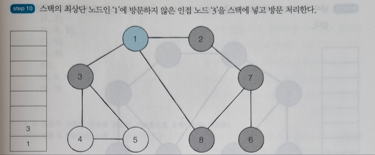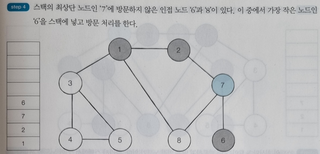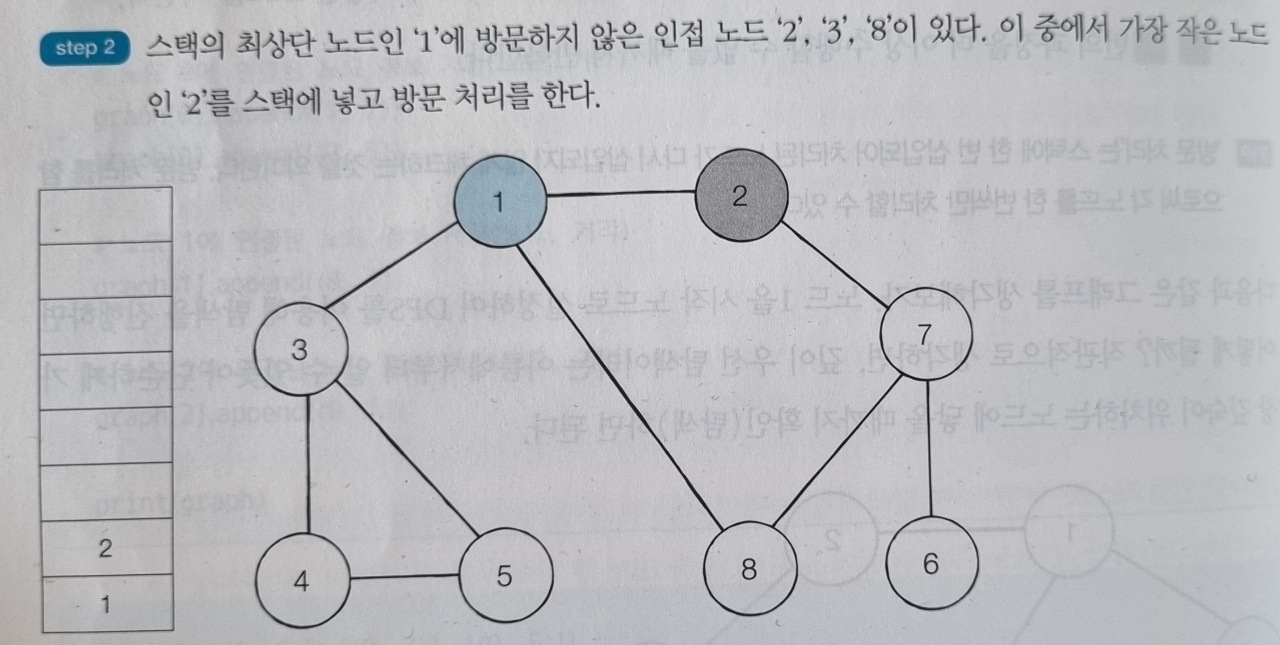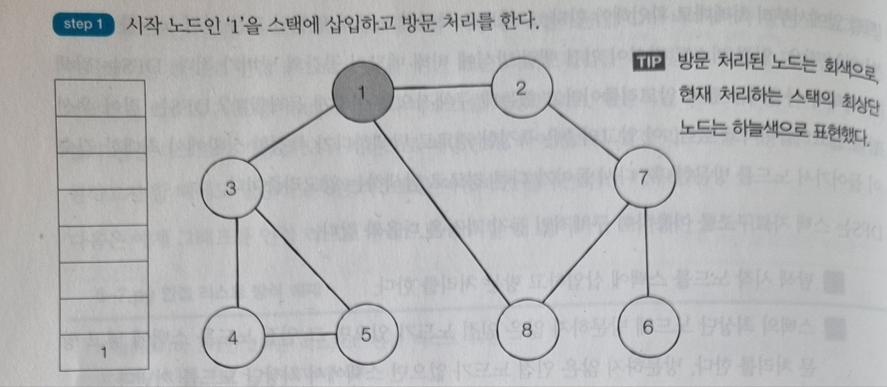 - 탐색 시작 노드를 스택에 삽입하고 방문 처리를 한다.