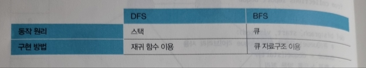 DFS와 BFS의 구현에 대해 알아보았는데, 간단히 정리하자면 다음 표와 같다. 더 다양한 방식으로 구현할 수 있지만 책에 실은 예제가 가장 간결한 방식이다.