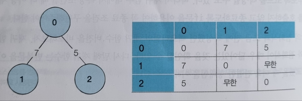 연결이 되어 있지 않은 노드끼리는 무한(Infinity)의 비용이라고 작성한다. 실제 코드에서는 논리적으로 정답이 될 수 없는 큰 값 중에서 999999999, 987654321 등의 값으로 초기화하는 경우가 많다. 이렇게 그래프를 인접 행렬 방식으로 처리할 때는 다음과 같이 데이터를 초기화한다.