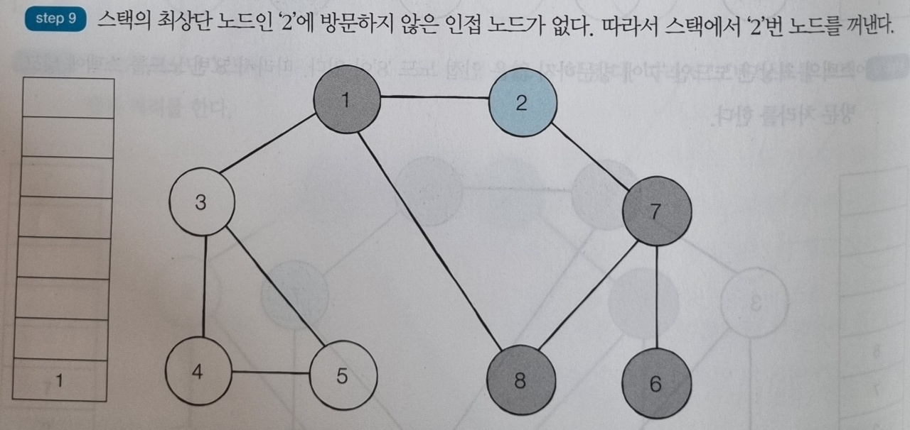 - 스택의 최상단 노드에 방문하지 않은 인접 노드가 있으면 그 인접 노드를 스택에 넣고 방문 처리를 한다. 방문하지 않은 인접 노드가 없으면 스택에서 최상단 노드를 꺼낸다.