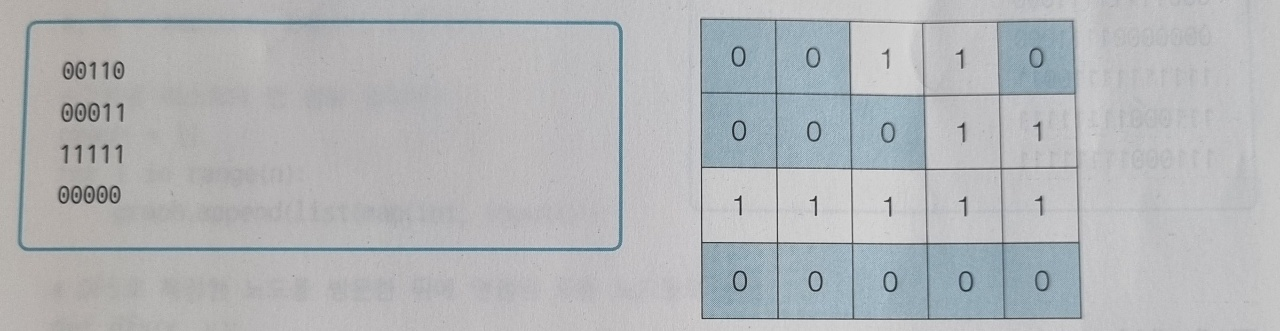 - 특정한 지점의 주변 상, 하, 좌, 우를 살펴본 뒤에 주변 지점 중에서 값이 '0'이면서 아직 방문하지 않은 지점이 있다면 해당 지점을 방문한다.