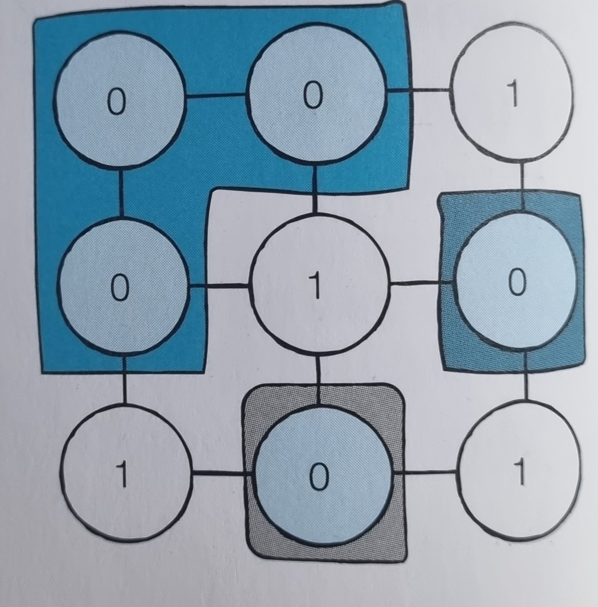 '0'인 값이 상, 하, 좌, 우로 연결되어 있는 노드를 묶으면 오른 쪽과 같이 세 묶음이 나올 것이다. 이러한 묶음을 찾아주는 프로그램을 어떻게 작성할 수 있을까?