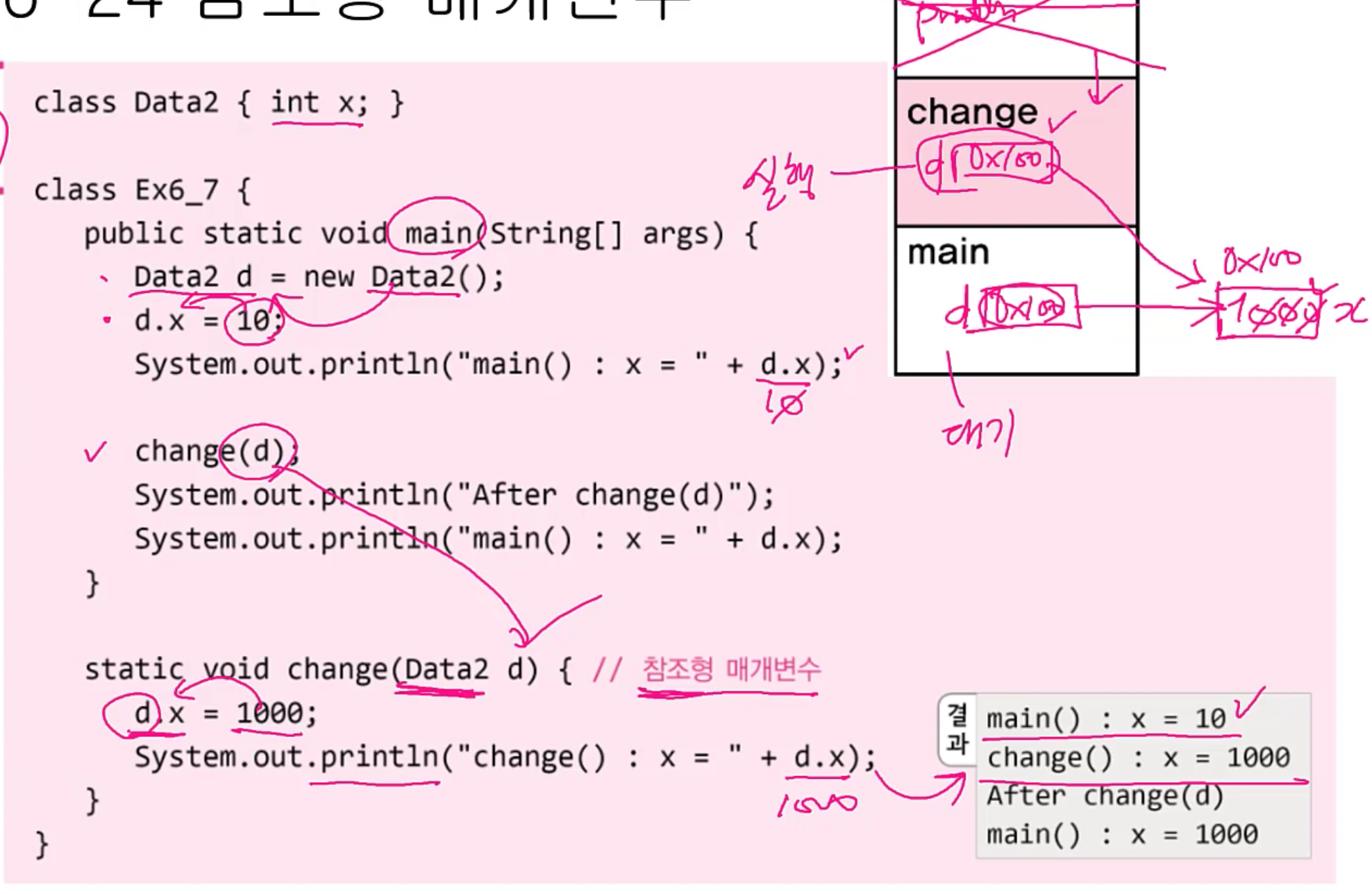 static void change(Data2 d) {// 참조형 매개변수