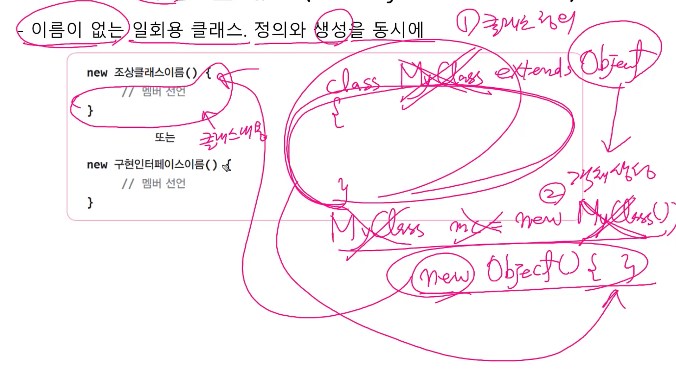 - 이름이 없는 일회용 클래스. 정의와 생성을 동시에