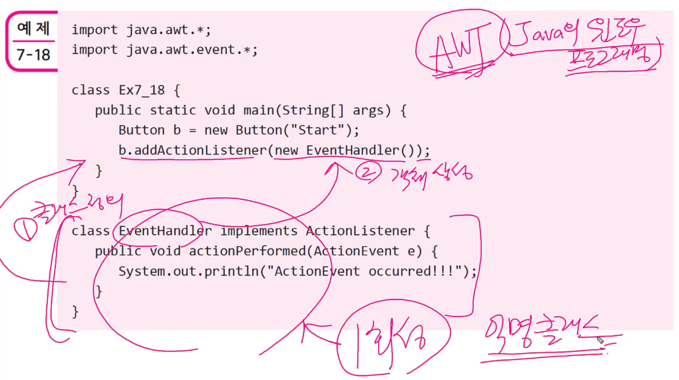 EventHandler라는 이름을 사용하지 않고, 조상 또는 인터페이스 이름(ActionalListener)을 사용해서 익명클래스로 만들어서 사용한다.