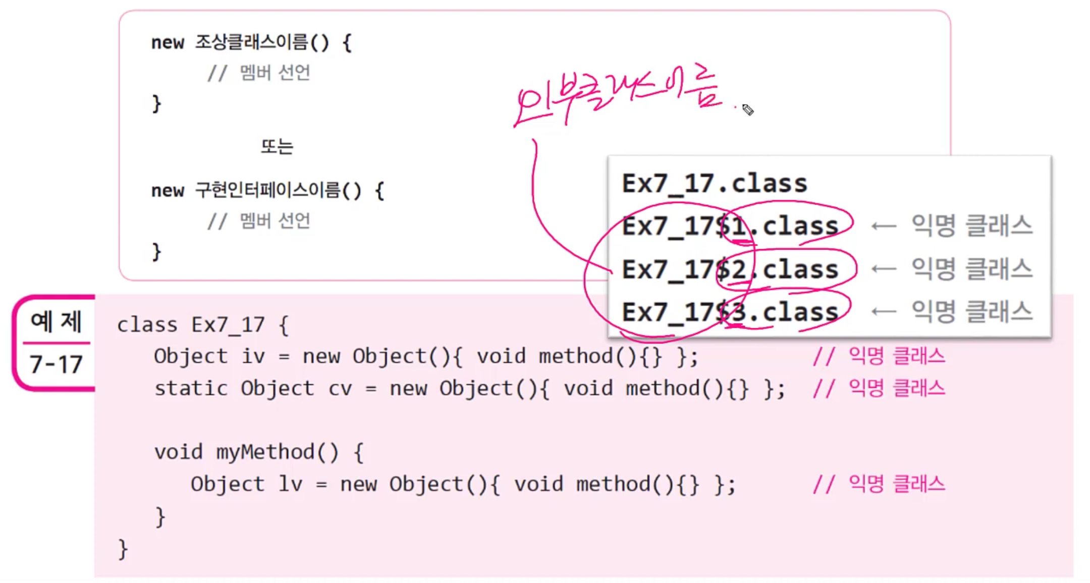 익명클래스라서 컴파일하고나면, 이름이 숫자로 붙는다. 그리고, Ex7_17의 내부클래스이므로 외부클래스 이름이 따라 붙는 것을 확인할 수 있다.