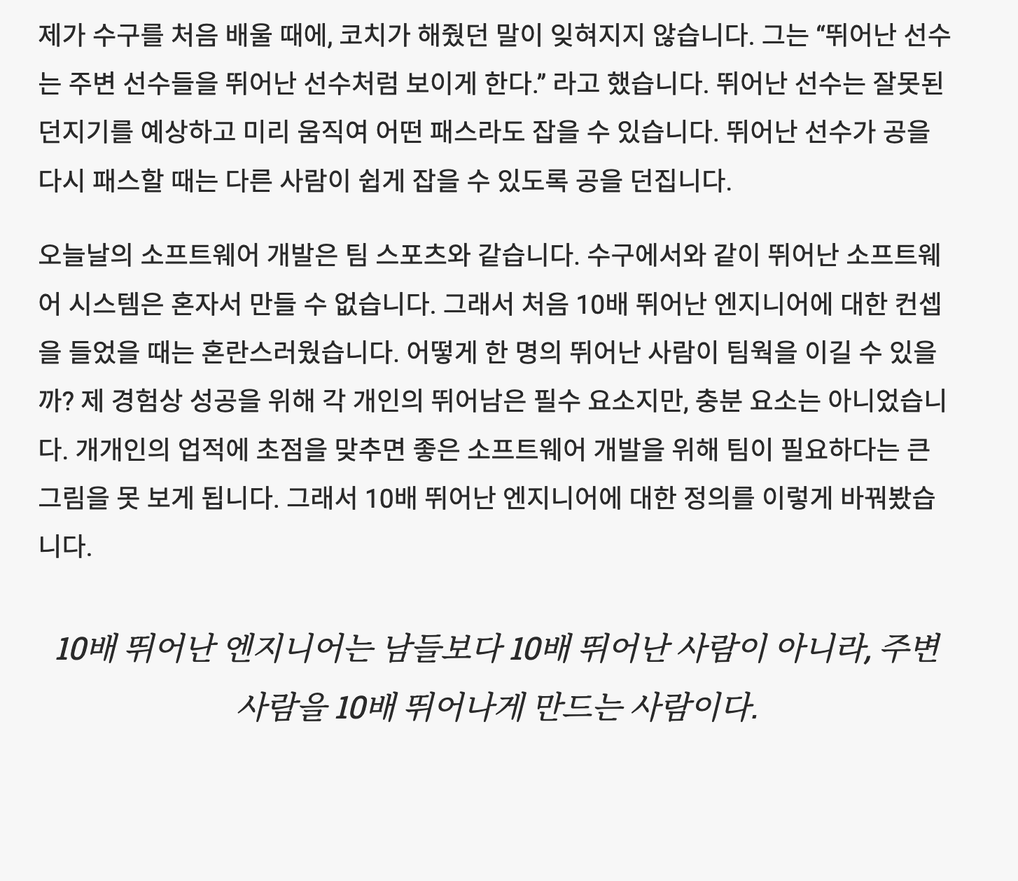 10배 뛰어난 엔지니어는 남들보다 10배 뛰어난 사람이 아니라, 주변 사람을 10배 뛰어나게 만드는 사람이다.