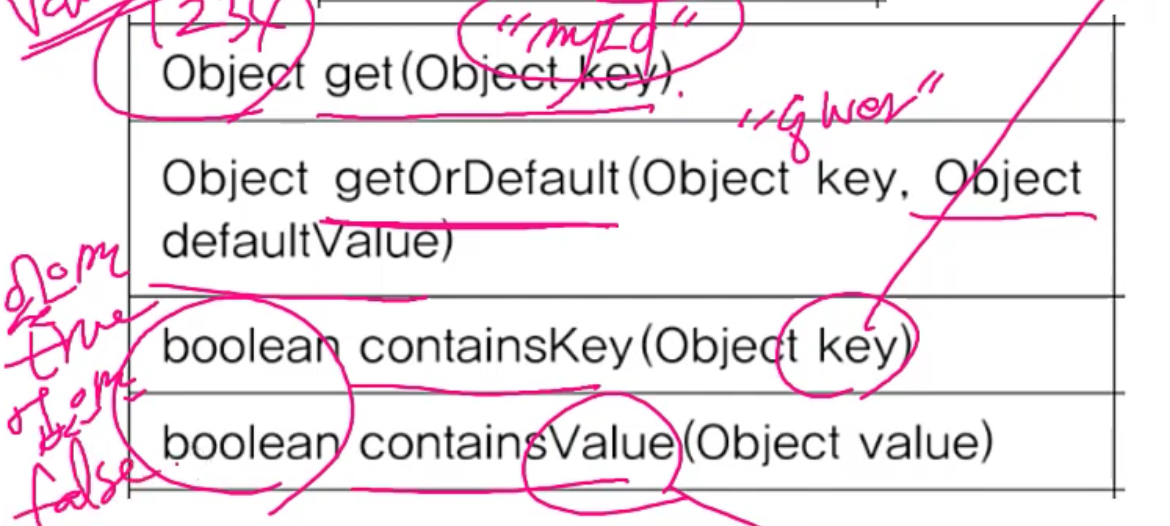 get(Object key)는 입력된 키에 따른 value를 반환해준다. myId라는 key와 1234라는 value가 한 쌍일 때,