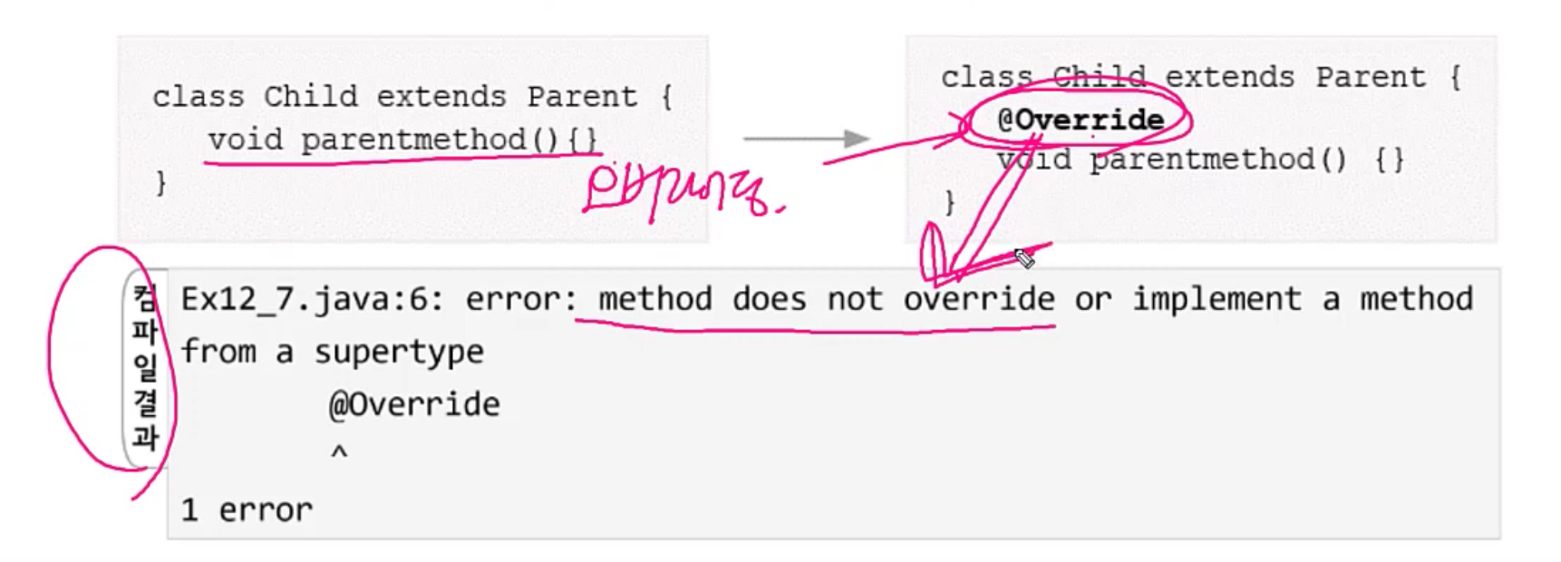 그러면, 위의 예시처럼 오타 친 경우에 컴파일하면, 컴파일결과가 "해당 메서드는 오버라이딩 한 것이 아니다."
