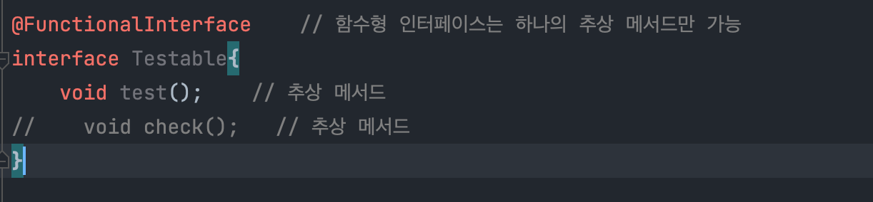 @FunctionalIterface 애너테이션을 붙여서 하나의 추상 메서드만 작성했는지 컴파일러가 체크하도록 하는 것이 좋다.