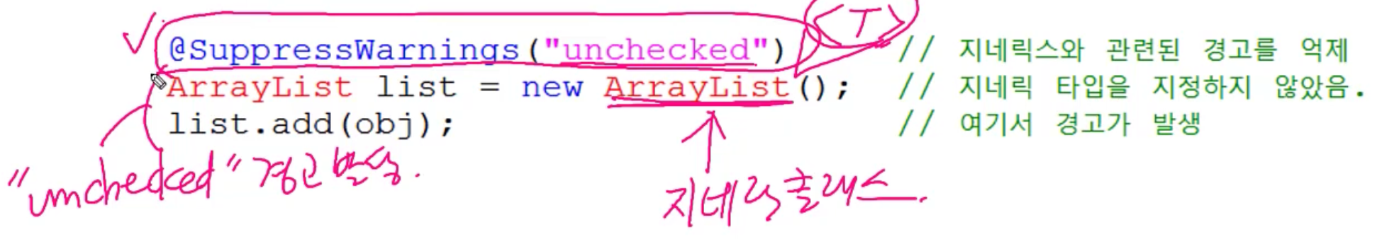 <T>를 넣어줘야 한다. 그런데, 지네릭 타입을 지정하지 않아서 "unchecked"라는 종류의 경고가 발생한다.
