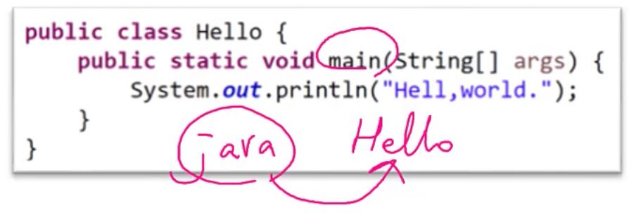 그러면, java인터프리터가 Hello클래스에 있는 메인 메서드를 호출한다.