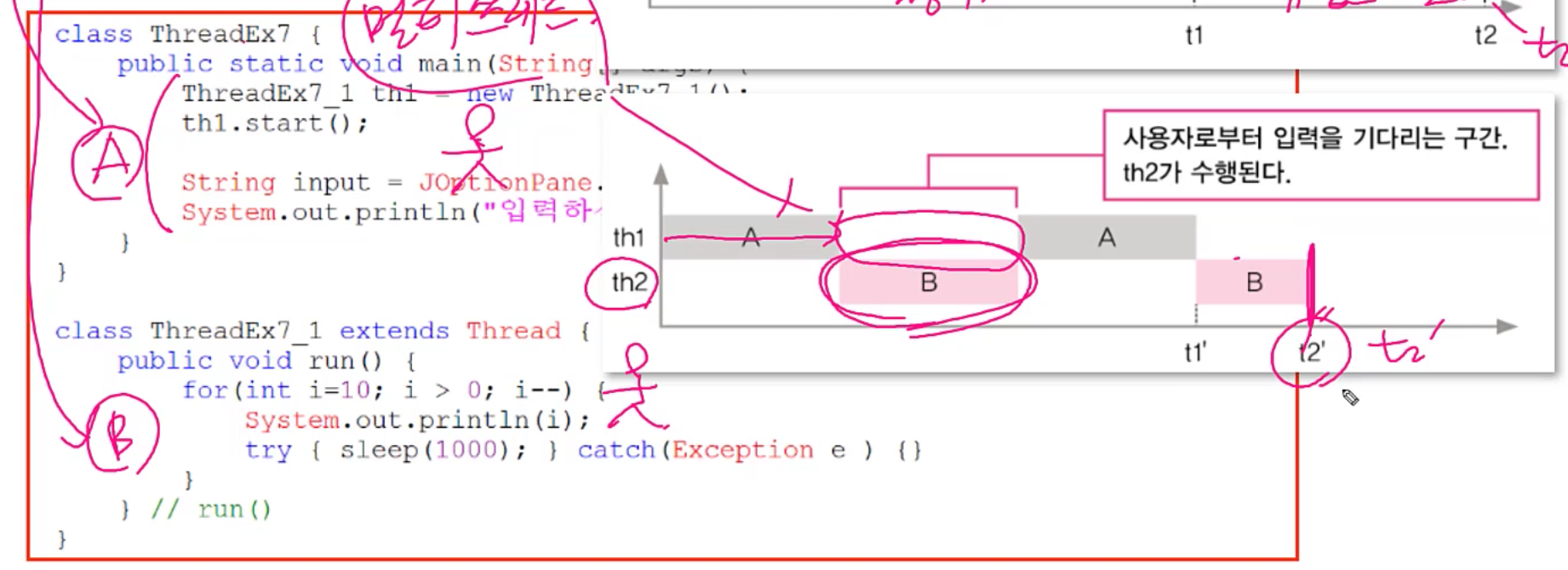 A작업을 메인쓰레드가 하고, B작업을 별도의 쓰레드로 돌린다.