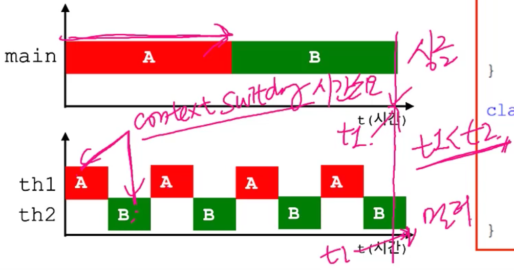 그런데 그림을 보면, 멀티쓰레드의 작업시간이 조금더 길게 걸리는것처럼 그림을 그렸는데,