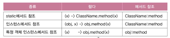 - 하나의 메서드만 호출하는 람다식은 '메서드 참조'로 간단히 할 수 있다.