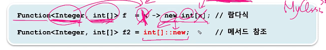 Function<Integer, int[]> f= x -> new int[x]; 에서 Integer는 x 즉 배열길이이다.
