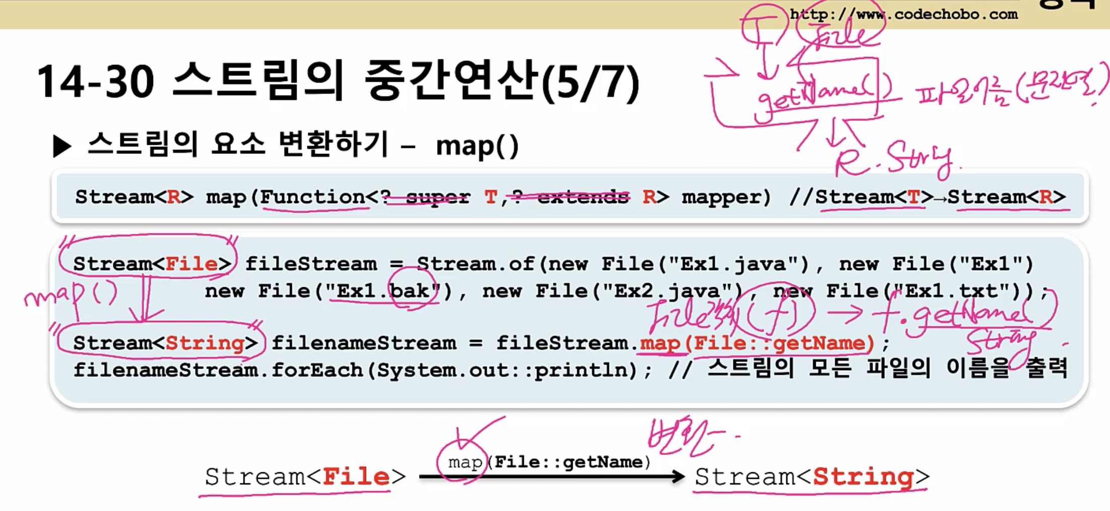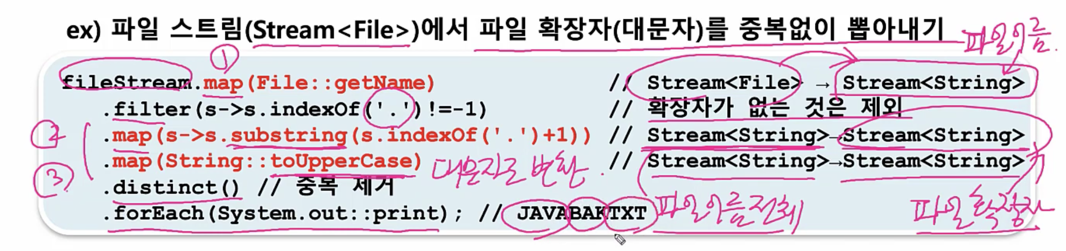 그래서 map(File::getName) 메서드를 통해서 Stream<File> 을 Stream<String>으로 바꿀 수 있는 것이다.