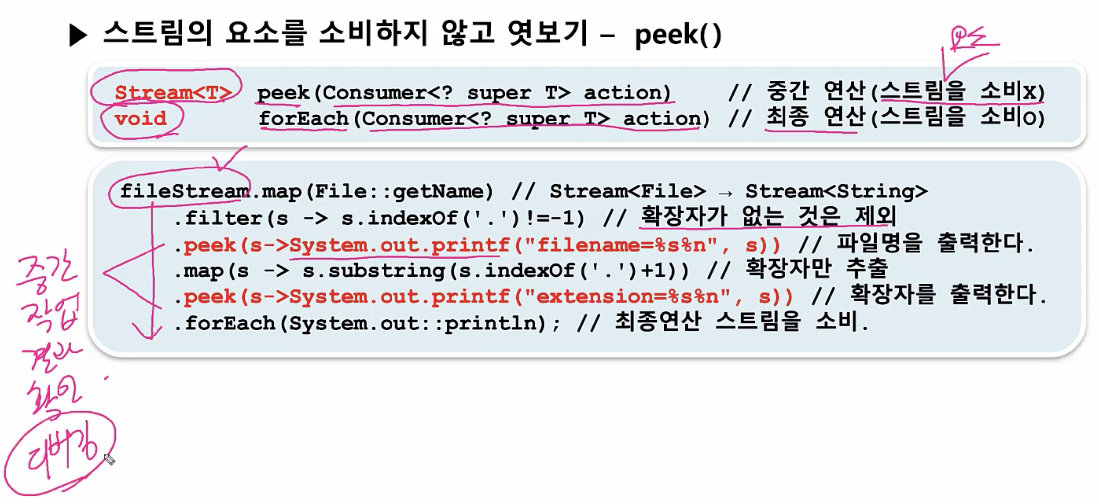 즉, peek는 반환타입이 Stream이고, forEach는 반환타입이 void이다.