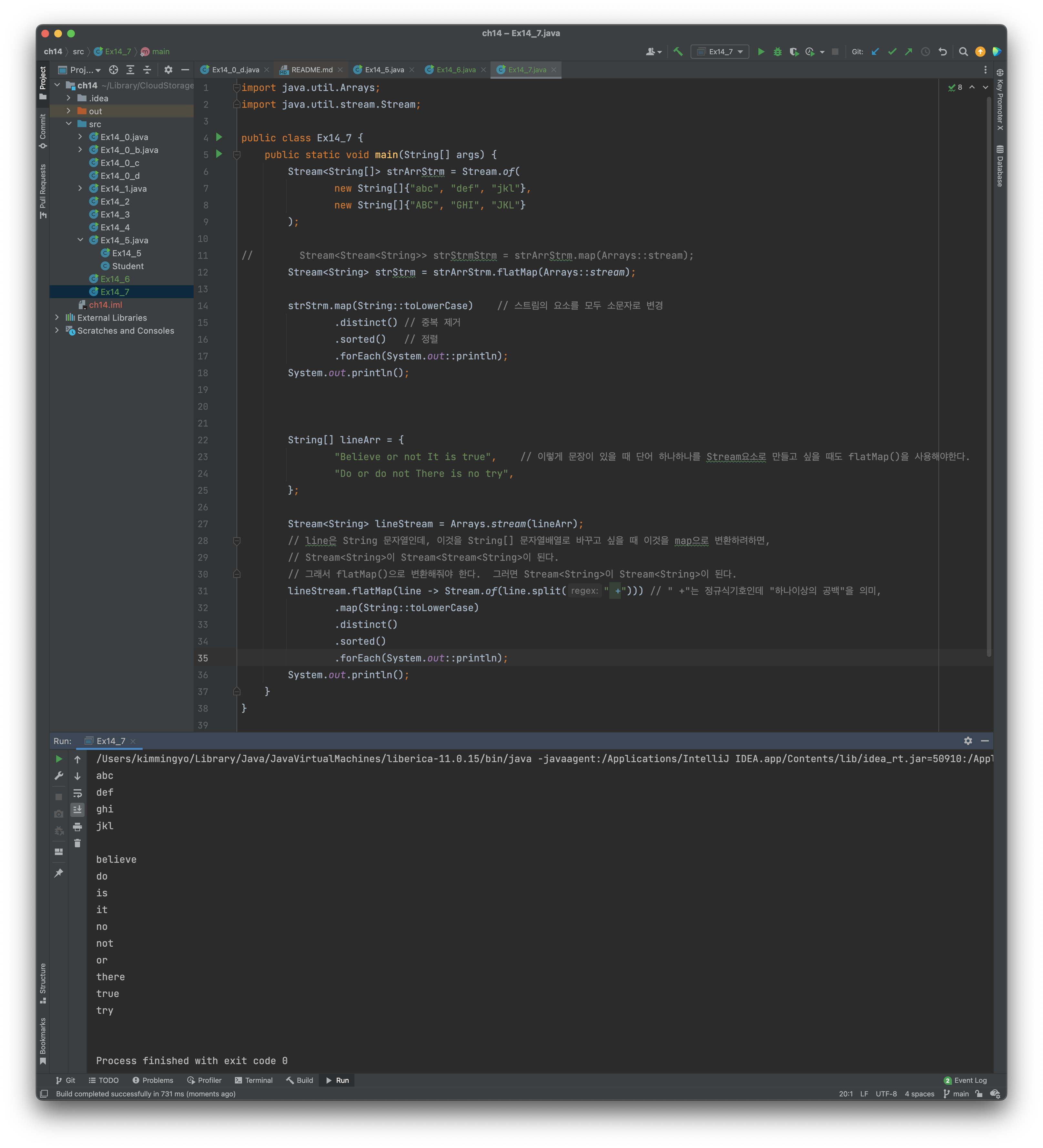 그래서 아래의 결과처럼 각 문자열 배열의 요소가 하나의 스트림 요소로 들어오는 것을 원한다면, flatMap()을 사용해야 한다.