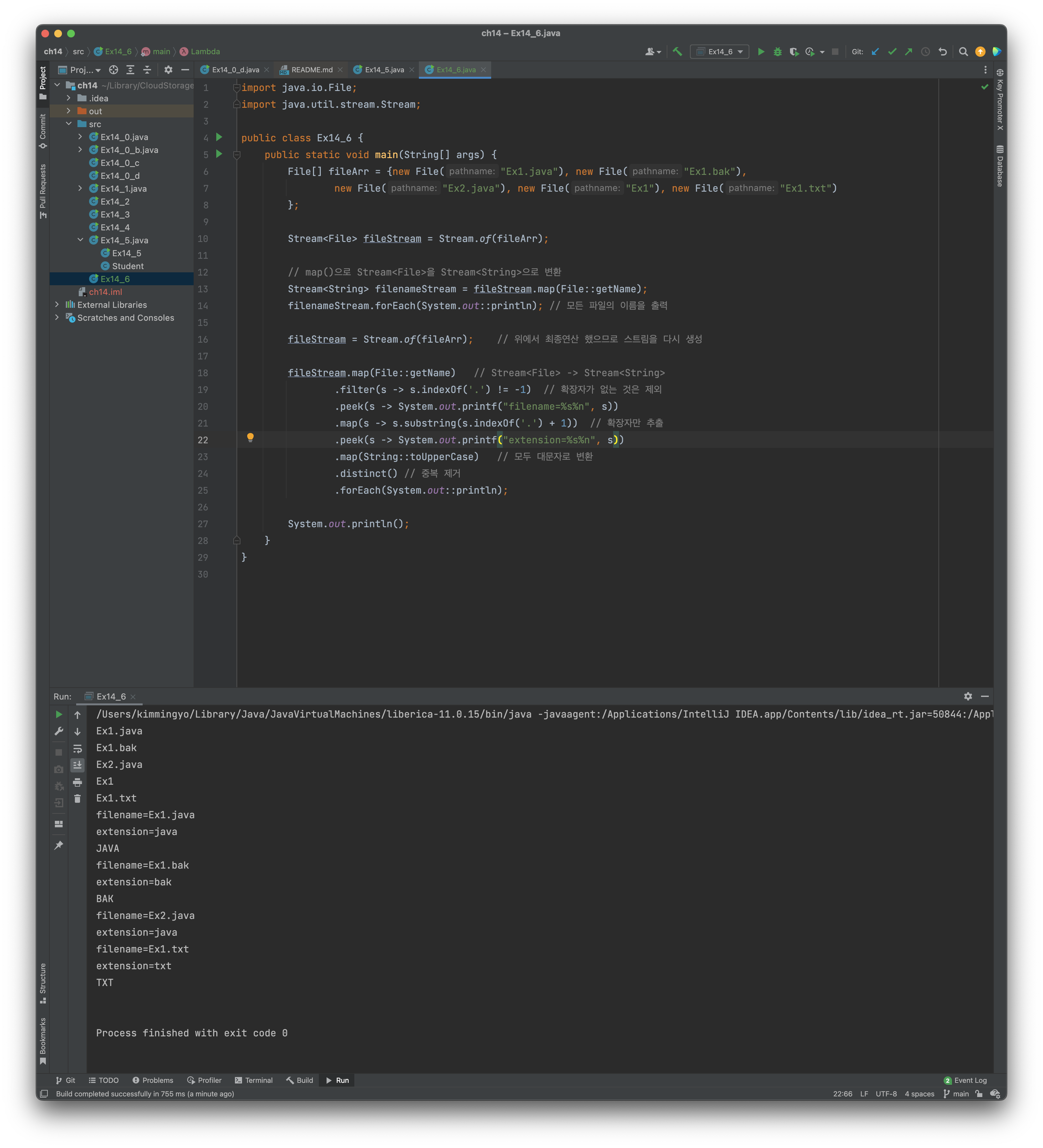 map()을 이용해서 확장자를 뽑아냈다. 여기서는 같은 타입으로(<String> -> <String>) 변환을 했다. 즉 파일이름 전체 -> 파일 확장자만 반환하도록 하였다.