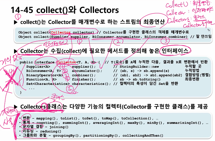 - collect()는 Collector를 매개변수로 하는 스트림의 최종연산