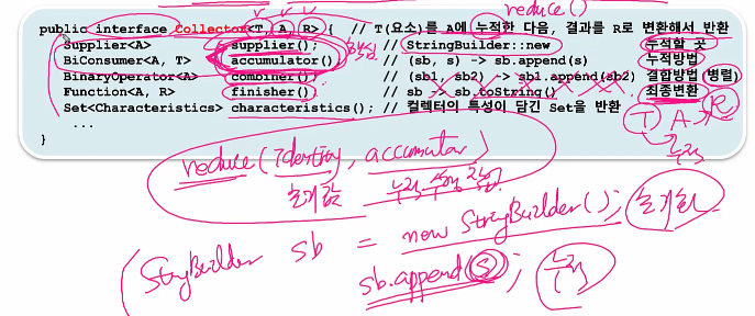 이러한 것들을 구현해서 매개변수로 collect(Collector collector)에 매개변수로 넣어줘야 한다.