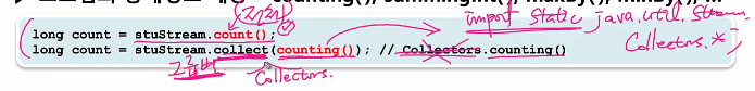 stuStream.collect(counting()) 이렇게 사용하면 된다. 사실 이것은 Collectors.이 생략된 것이다.
