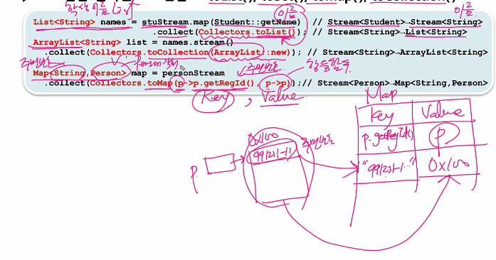 Stream<Student>에서 이름만 뽑아서 Stream<String>으로 만든 후, List<String>에 저장하는 것이다.