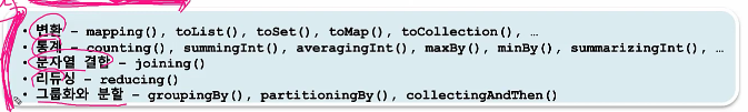 - Collectors 클래스는 다양한 기능의 컬렉터(Collector를 구현한 클래스)를 제공