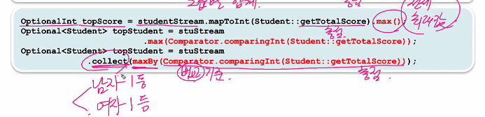 .collect(maxBy())를 사용할 때는 비교기준과 총점을 주면 총점의 최대값을 얻을 수 있다.