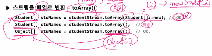 그래서 studentStream을 Student[]에 담으려면 매개변수 있는 .toArray(Student[]::new)를 사용해야 한다.