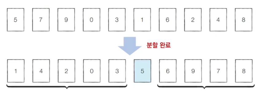 분할 후 한쪽 정렬이 끝났으면 이후에는 정렬을 할 필요(부분 문제 반복 X)가 없다고 생각하면 된다.
