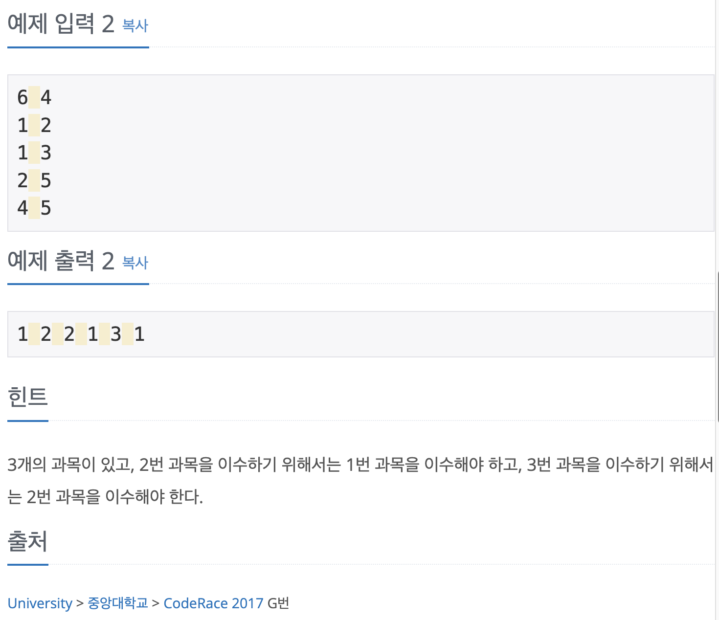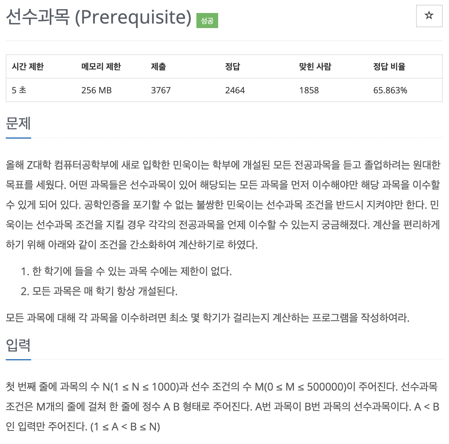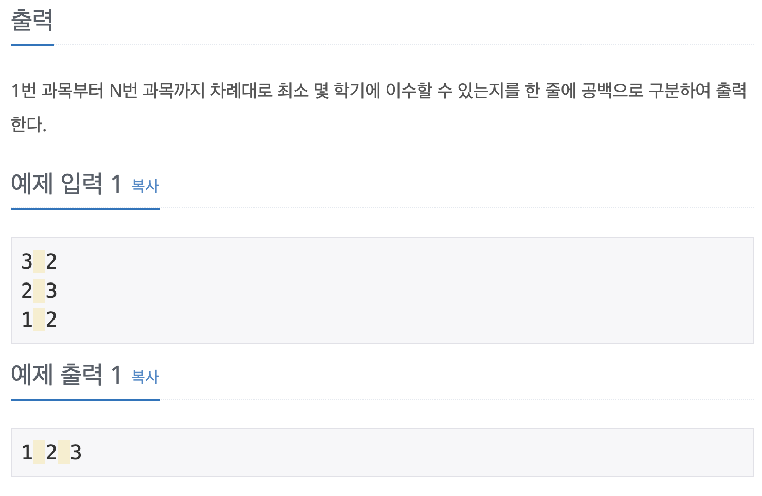 첫 번째 줄에 과목의 수 N(1 <= N <= 1000), 선수 조건의 수 M(0 <= M <= 500000)